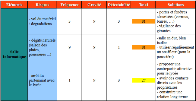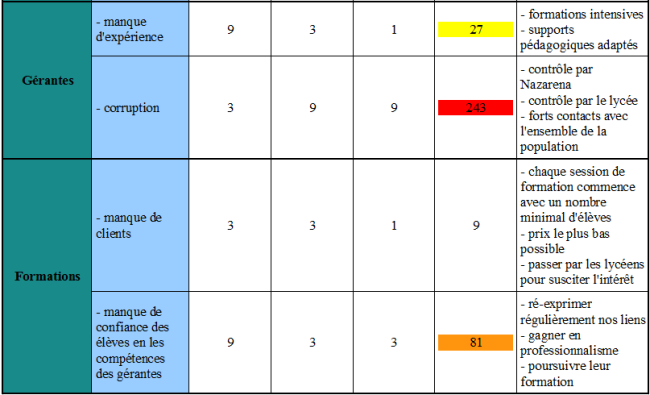 L’évaluation des risques a été réalisée grâce à la boîte à outils SIFE qui présente l’AMDEC (Analyse des Modes de Défaillances, de leurs Effets et de leur Criticité). Le caractère critique d’un risque se calcule en multipliant trois facteurs (1/3/9) représentant la fréquence (rare/moyenne/souvent), la gravité (minime/moyenne/importante) et la détectabilité (facile/moyenne/faible).
