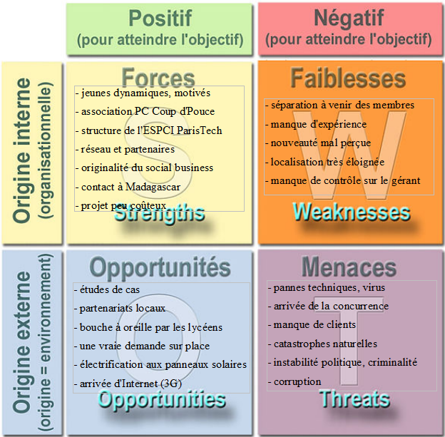 De façon préliminaire, nous avons cherché à évaluer le projet MadaNet. Pour cela, le tableau SWOT – Strengths (forces) Weaknesses (faiblesses) Opportunities (opportunités) Threats (menaces) – est un excellent outil d’analyse pour faire le bilan des atouts et faiblesses qu’ils dépendent de nous ou de facteurs extérieurs.