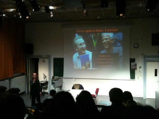 Le premier intervenant est Olivier Maurel : manager de l’innovation sociale pour le groupe Danone. Il est présent et organise toutes les manifestations des Danone Communities. Au travers de l’expérience de prédécesseurs (1001 fontaines, Grameen Danone, …), il redéfinit le social business de façon concrète. Dans un second temps, Christian Vanizette nous fait part de son parcours : un tour du monde à la rencontre des entrepreneurs sociaux et la création du gang Make Sense.